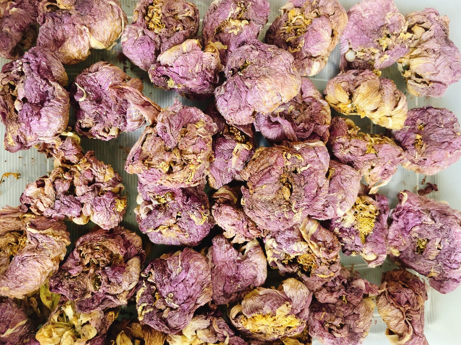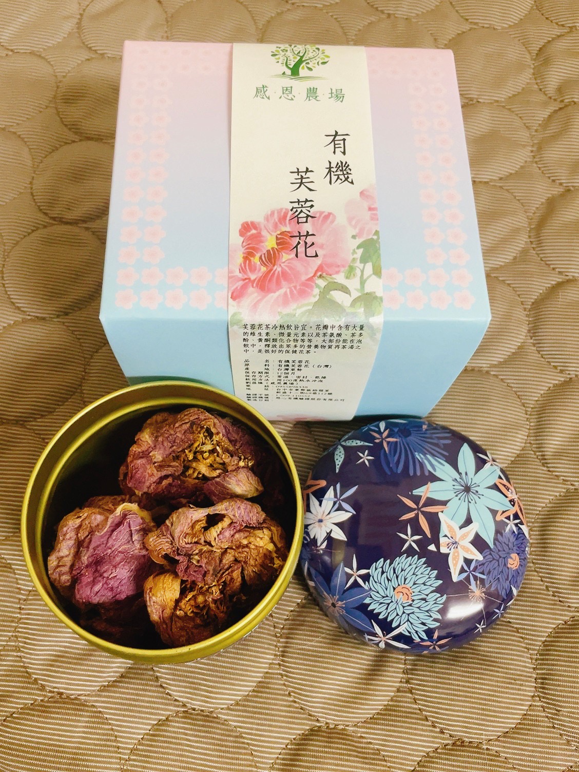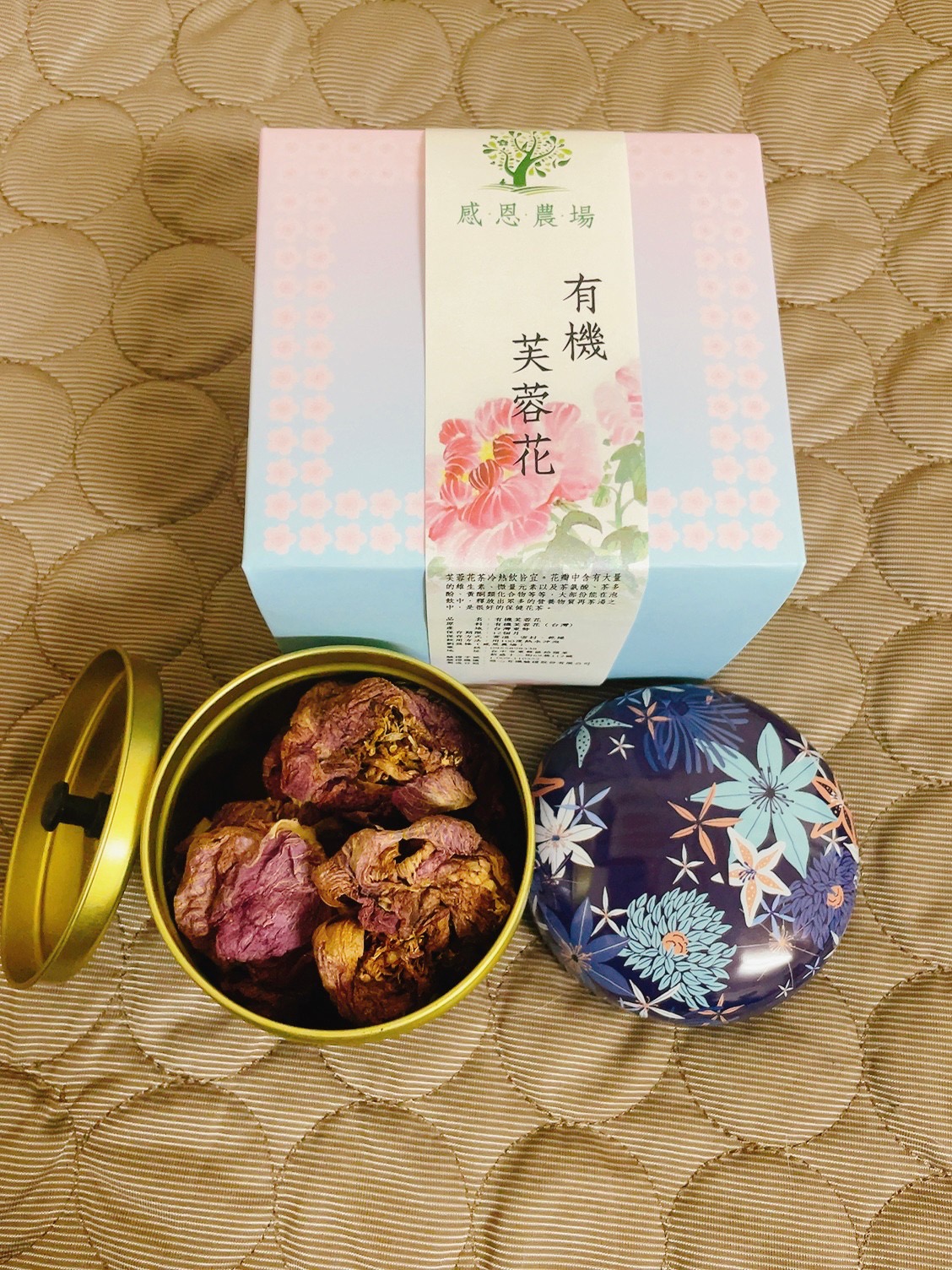 芙蓉花,感恩農場,種植在台中東勢,最,人工除草手工採摘,日曬萎凋,低溫烘培,細心照顧出,完全不噴灑農藥,可以安心喝的芙蓉花茶,產量少,花瓣中含有的多種胺基酸,維生素和微量元素,黃酮類物質大部分也能在泡飲中滲透到水中,是很好的保健花茶。