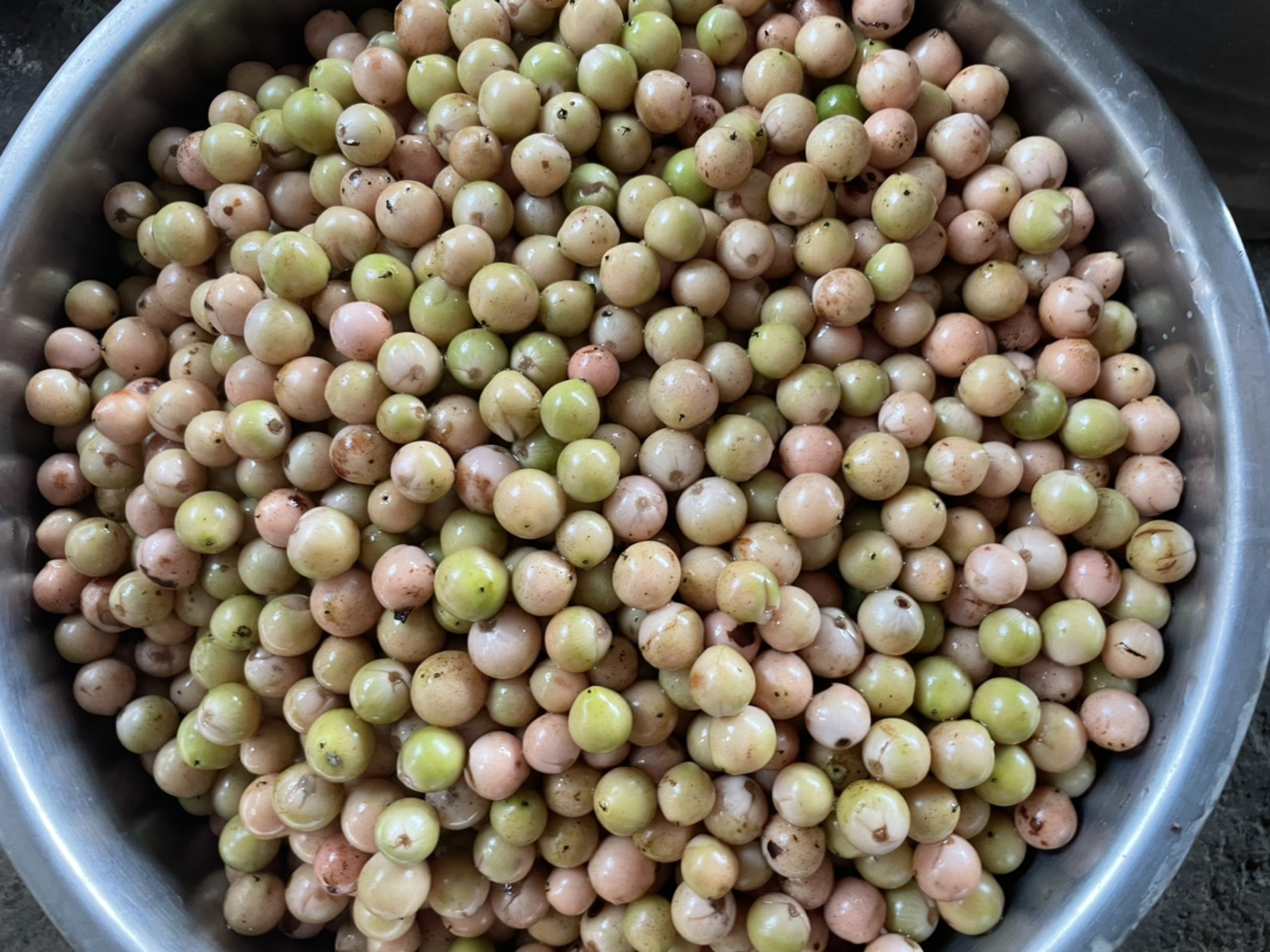 感恩農場種植的老樹叢破布子,耗工費時的抗疫破布子,防疫期很可以來挑破布子,可以一直挑一直挑白天到黑夜,從爬上大樹鋸下來,截小段、剪枝條、裝上麻布袋,回到家中清洗、挑選、到蒸煮,無ㄧ不是手工和人工再精心小火煮4個小時,完成好吃的破布子醬.