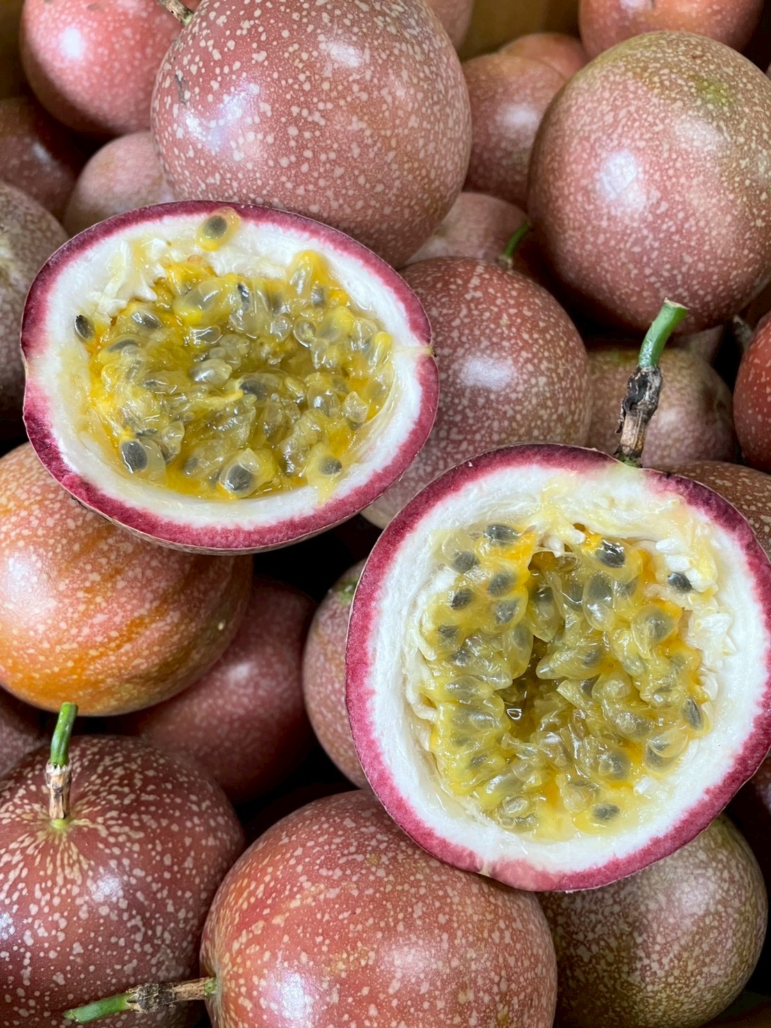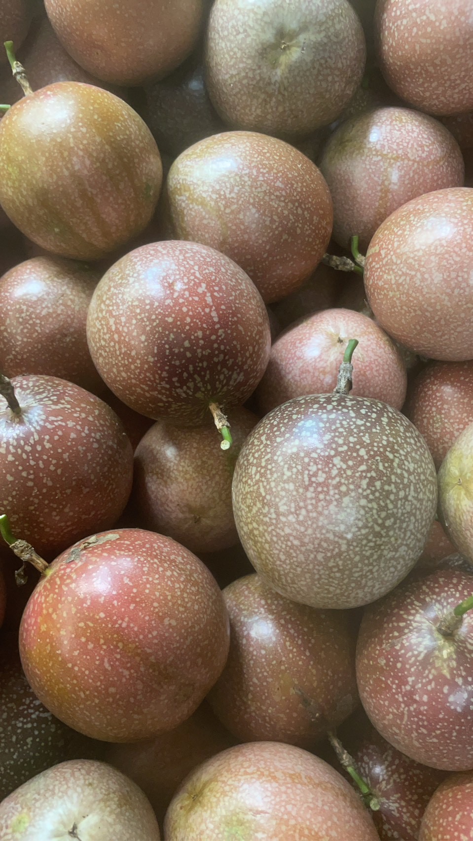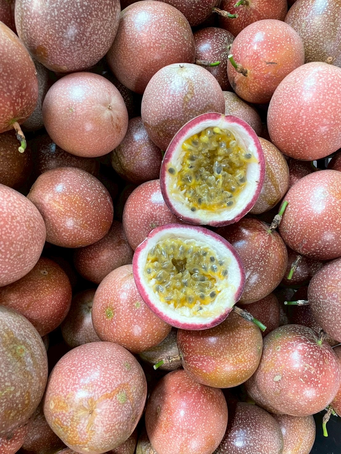 滿天星百香果(又稱「蜜糖百香果」)是台灣改良出的甜味品種,外皮呈紅紫色帶細白斑點,外觀如滿天星般閃亮,因此得名。